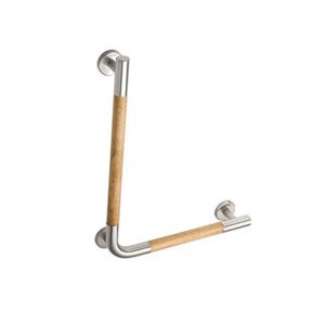 ควรติดตั้งราวจับเพื่อช่วยในการพยุงตัวทั้งสองข้างของอ่างล้างหน้า และโถสุขภัณฑ์ โดยสามารถเลือกใช้ราวทรงตัวรูปตัวแอล หรือ ราวทรงตัวแขนพับแบบสวิง ตามความเหมาะสม และควรมีราวจับที่ผนังนำทางไปจนถึงส่วนอาบน้ำ ติดตั้งสูงจากพื้น 60-75 cm ทั้งนี้ สีของราวจับควรดูแตกต่างจากสีของกระเบื้องผนังอย่างชัดเจน