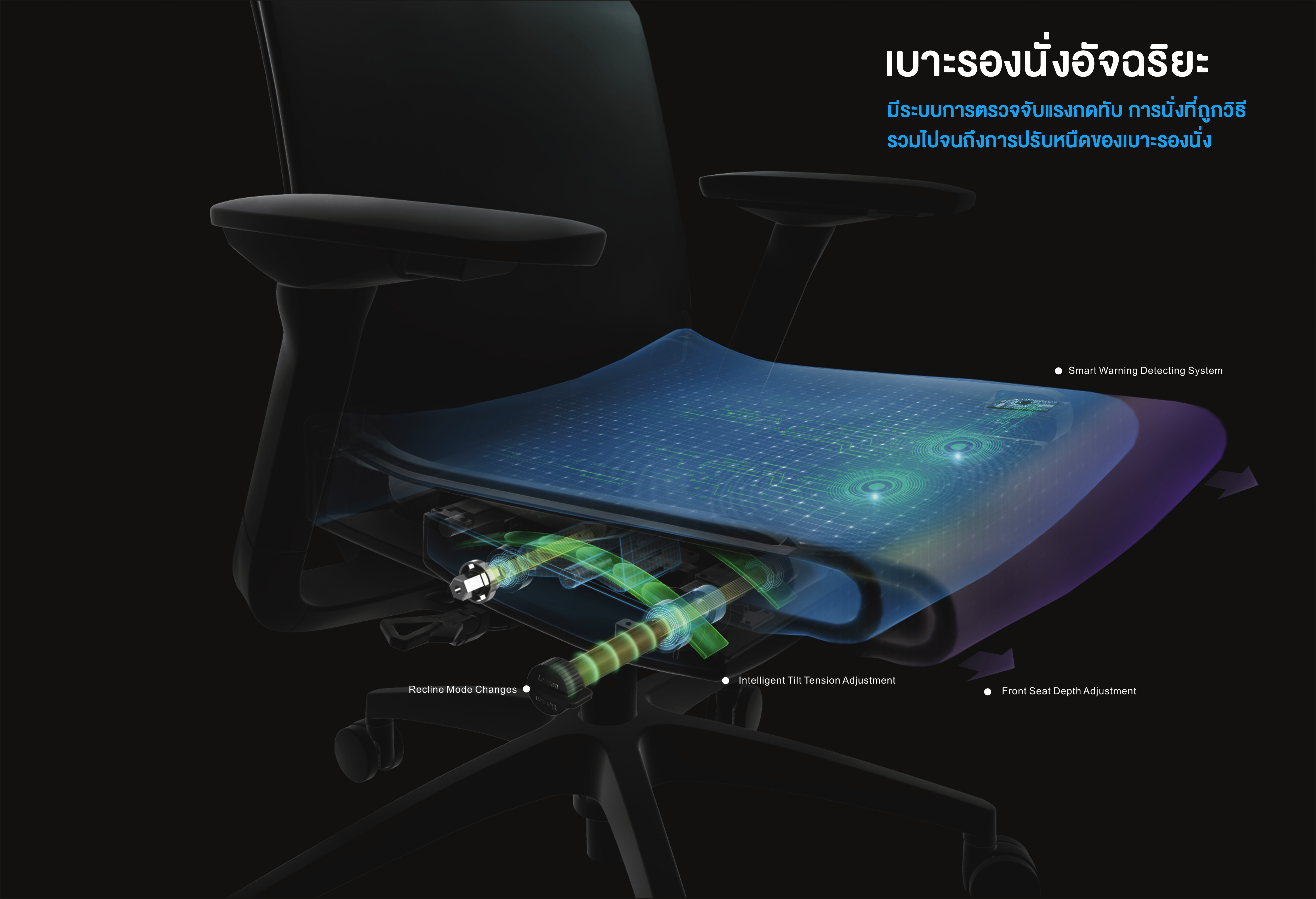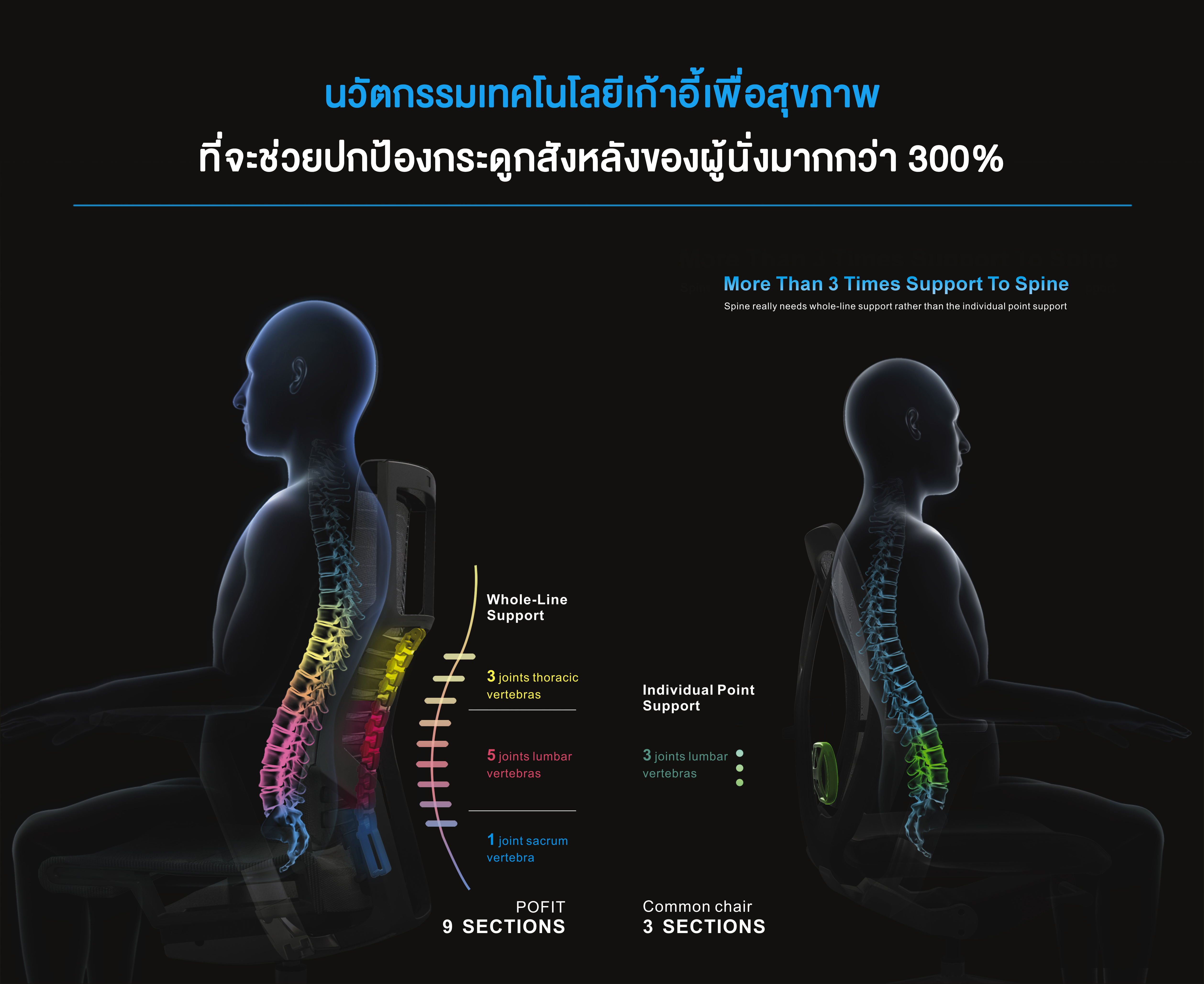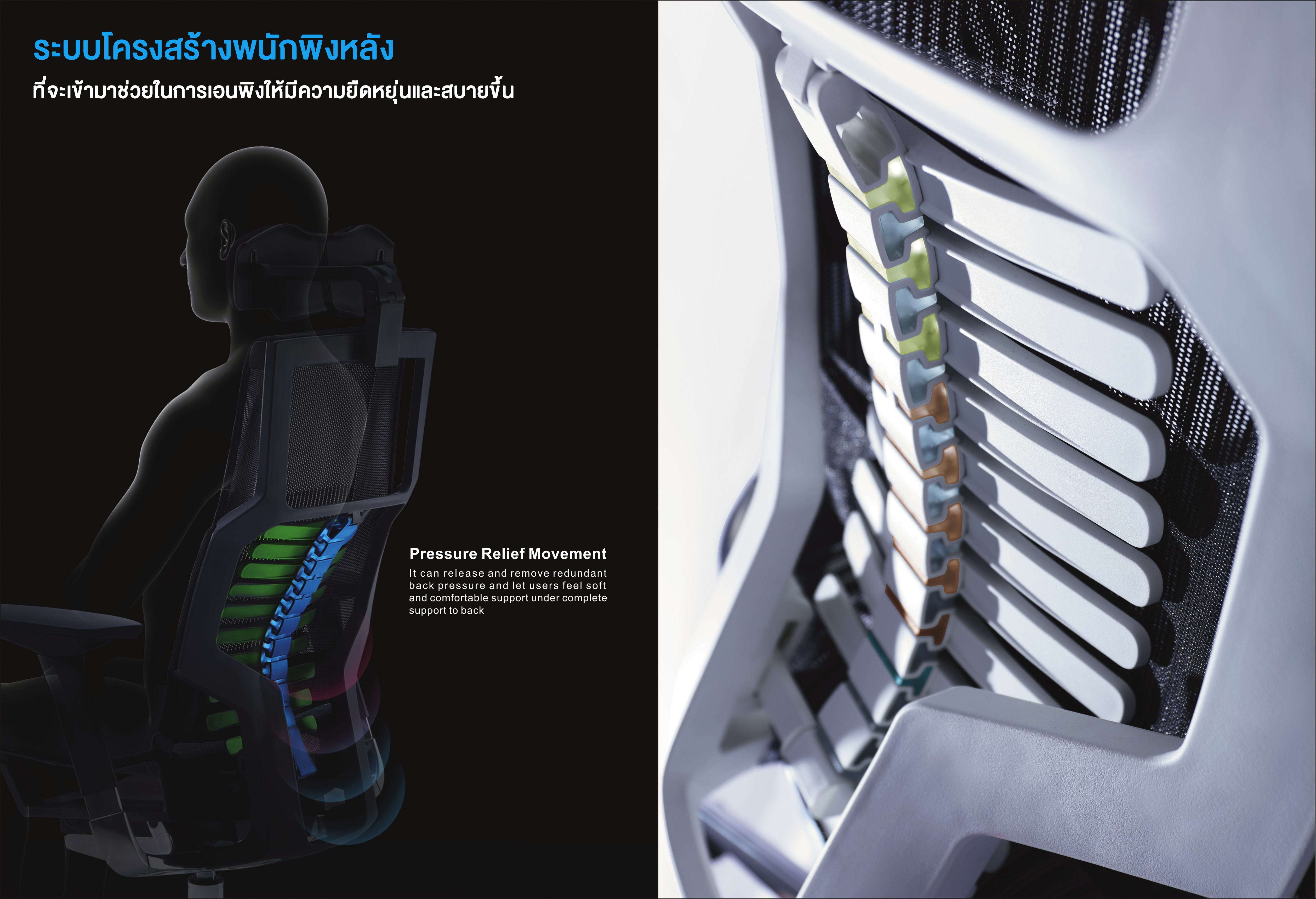 - ออกแบบระบบBionic Spine โดยใช้ร้างมนุษย์เป็นต้นแบบ ให้การรองรับปกป้องในการนั่งของสรีระ UpTo 300 เปอร์เซ็นต์ ช่วยลดความปวดเมื่อย กดทับ จากการนั่งทำงาน