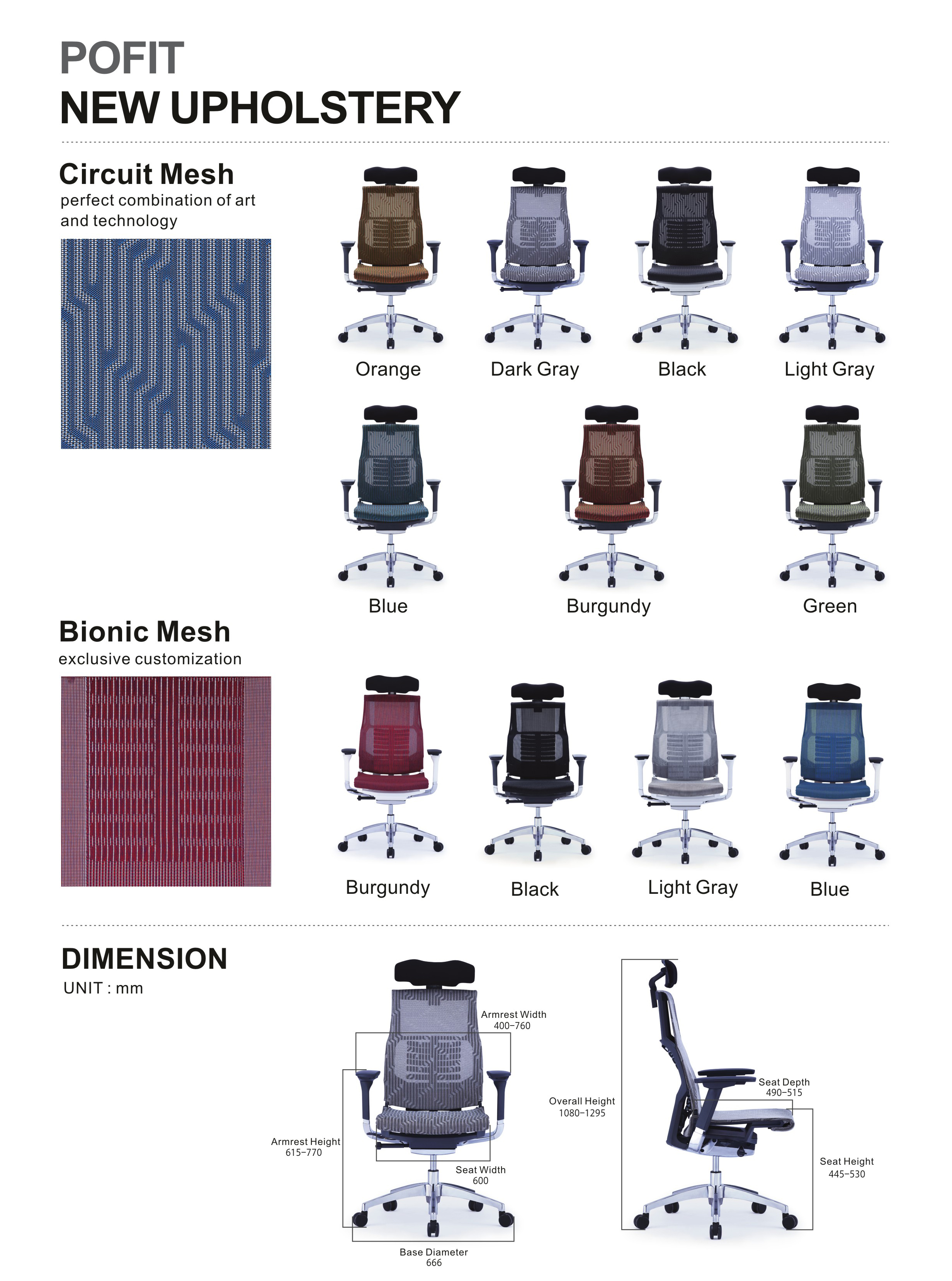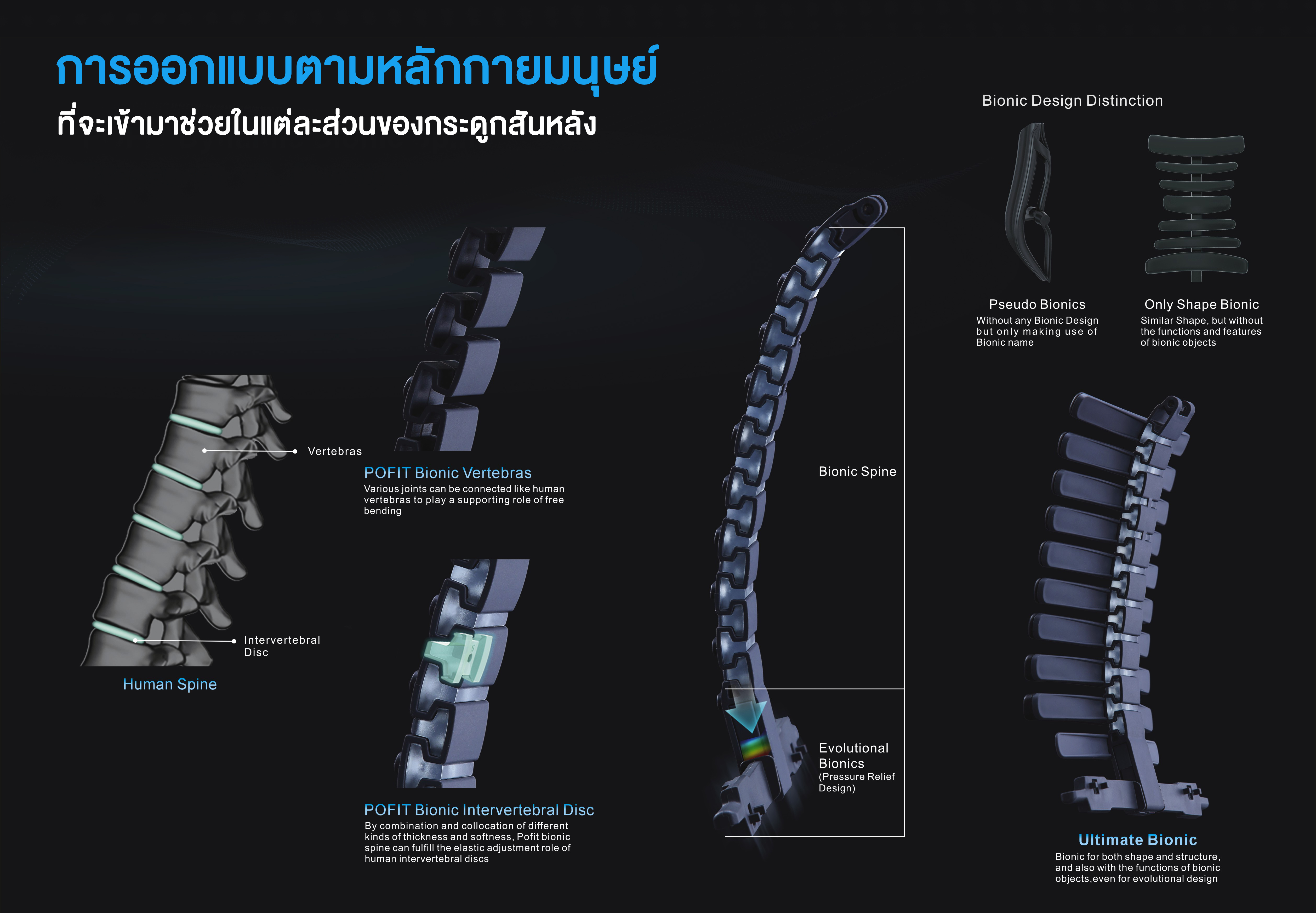เป็นการผสมผสานกันอย่างลงตัวของ การออกแบบของเก้าอี้ Ergonomices คู่กับเทคโนโลยี ไบโอนิค( Bionic Spine ) โดยใช้ร่างกายของมนุษย์เป็นต้นแบบ ทดสอบจากมุมและองศาของการนั่งที่แตกต่างในกระดูกสันหลัง ด้วยการบันทึกผ่านเครื่อง X-ray เพื่อที่การยืนยันว่าเก้าอี้ POFIT ในระบบBionic Spine สามารถให้การรองรับส่วนโครงของกระดูกสันหลังได้อย่างแม่นยำถึง 300 เปอร์เซ็น ช่วยลดความเสือมของกระดูกที่เกิดจากแรงกดทับของการนั่ง โครงปีกนกทั้งสองข้าง รองรับกล้ามเนื้อแผ่นหลัง (Support) ทําให้การขยับตัวขณะทำงาน เกิดความยืดหยุ่น ลดความแข็งกระด้างในการพิงเอน ซึ่งแสดงให้เห็นได้ว่าการออกแบบเทคโนโลยีไบโอนิค Bionic Spine สามารถช่วยทําให้ผู้ใช้งานรู้สึกสบายผ่อนคลายในขนาดทำงาน ภายไต้การรองรับแผ่นหลังอย่างเต็มรูปแบบ