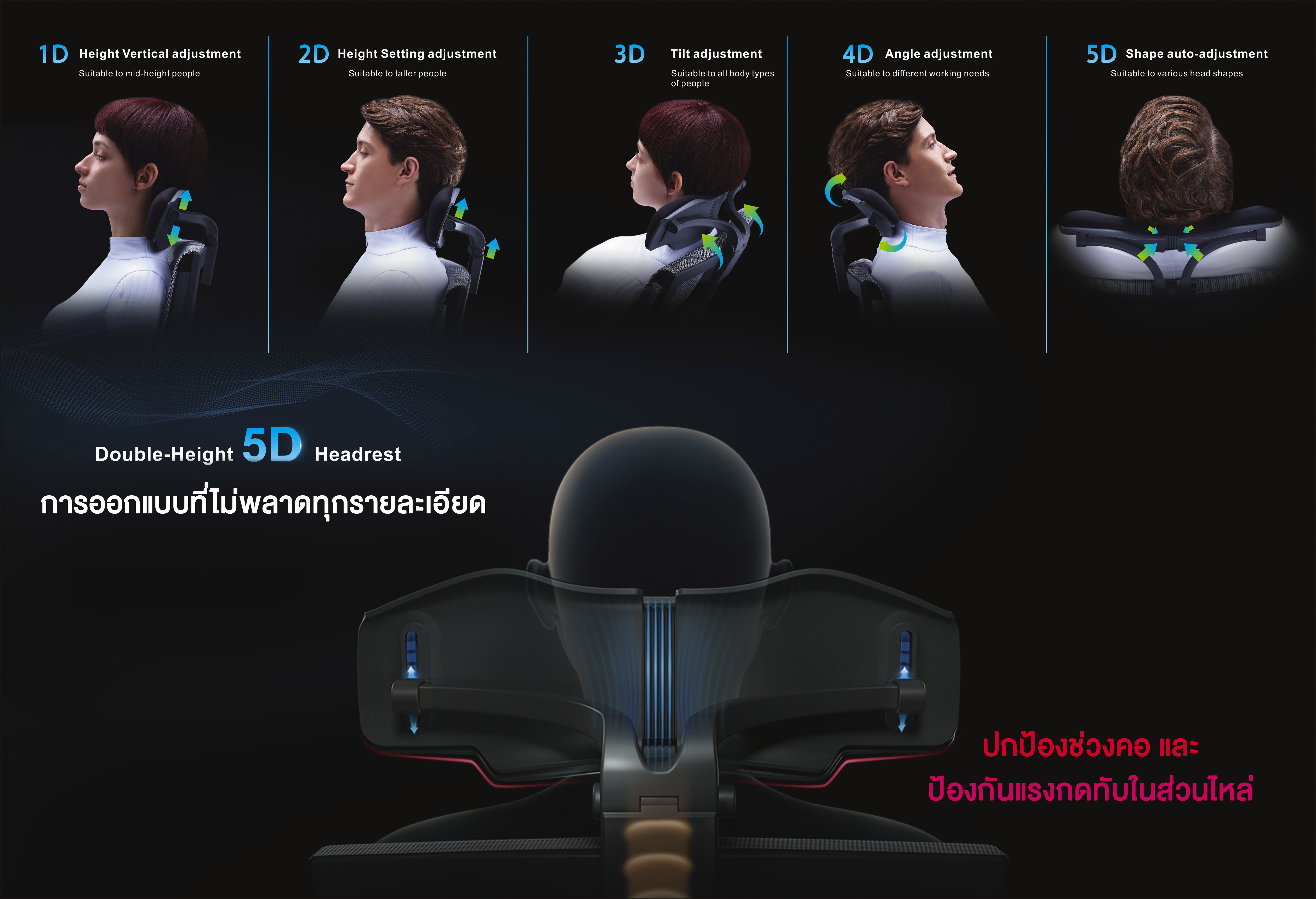 D5-ปรับกระชับที่รองศรีษะเมื่อเกิดการเอน - พนักพิงBionic Spine ปรับได้ 4 ระดับ เพื่อรองรับและปกป้องกระดูกสันหลังที่แตกต่างกันของผู้ใช้งาน