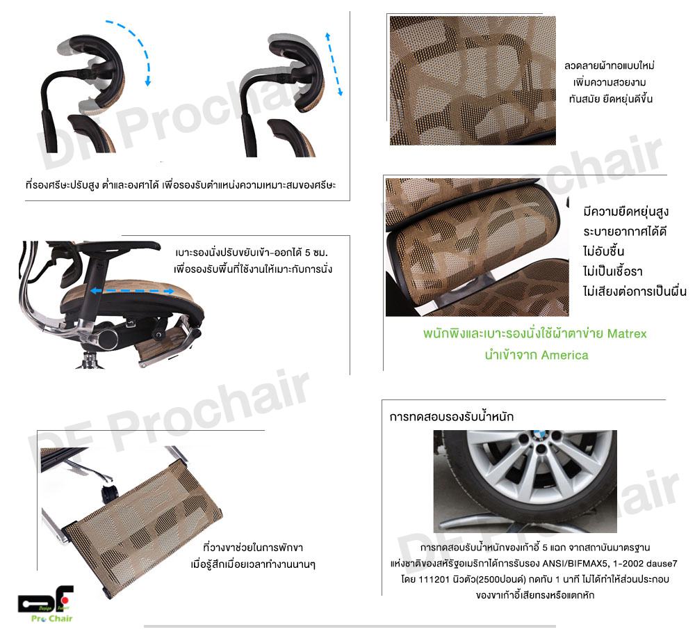 - พนักพิง และเบาะรองนั่ง ที่รองศีรษะใช้ผ้าตาข่าย ทุกผืนผ่านมาตรฐาน BIFMA ของแบรนด์ Matrex นำเข้าจาก America (www.matrex.net) มีความยืดหยุ่นสูง ระบายอากาศได้ดี ไม่อับชื้น ไม่เก็บเชื้อรา ไม่เสี่ยงต่อการเป็นผื่น