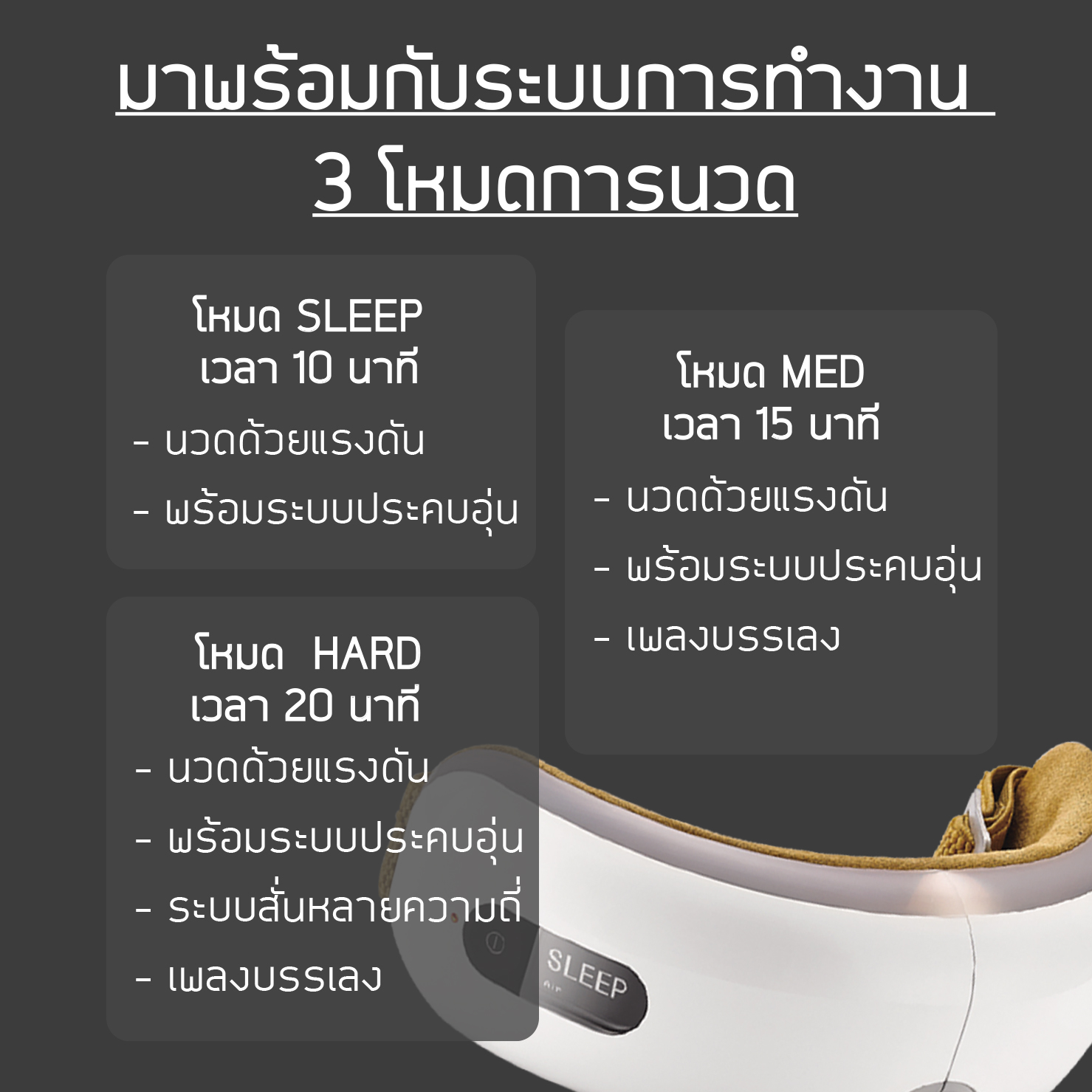 – โหมด SLEEP นวดด้วยแรงดัน พร้อมประคบอุ่น (10 นาที)